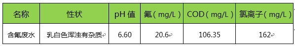 本公司是家大型的从事玻璃纤维系列制成品的生产及销售,包括玻璃纤维纱、布、织物等,其污水主要为经过前期降解COD、生化处理、反渗透回用等工序产生的浓水,现对该含氟废水废水进行处理。