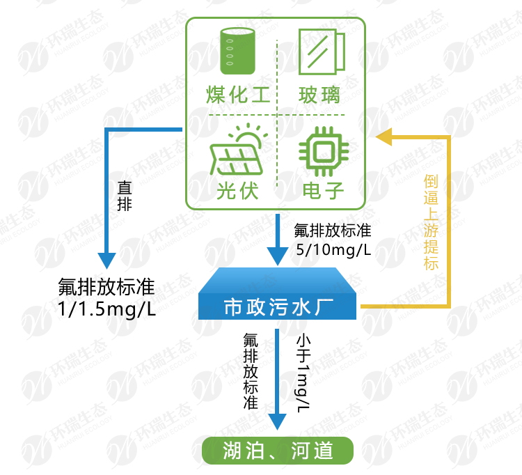 一些下游的污水处理厂能够通过合并多股废水的方式稀释总排水的氟浓度,但各地区环保局纷纷对相对应的污水处理厂提高含氟废水的标准至小于1mg/L,进而导致污水处理厂反过来限制上游的各类产生含氟废水工厂只能排放比以往更低的含氟废水。